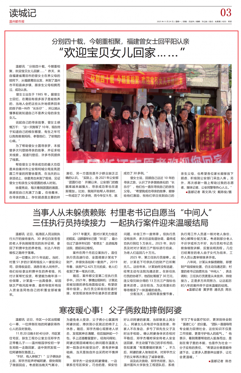 温都讯 “分别四十载,今朝重相聚,欢迎宝贝女儿回家……”昨天,来自福建省莆田市的曾女士在养父母的陪同下,从福建莆田出发,来到了温州市平阳县麻步镇,跟亲生父母相拥而泣,成功认亲。
