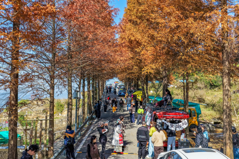 这条被誉为“温州最美红杉公路”的景观,其水杉多为上世纪八九十年代栽种的行道树,如今已成为一道亮丽的风景线。最佳观赏路段主要集中在陈北线、龙西线等区域,总计约22公里。赤橙黄绿的色彩与斑驳光影交织,宛如油画。游客们惬意随停,捕捉冬日的第一份浪漫,仿佛驶入了一个无需门票的天然影棚。