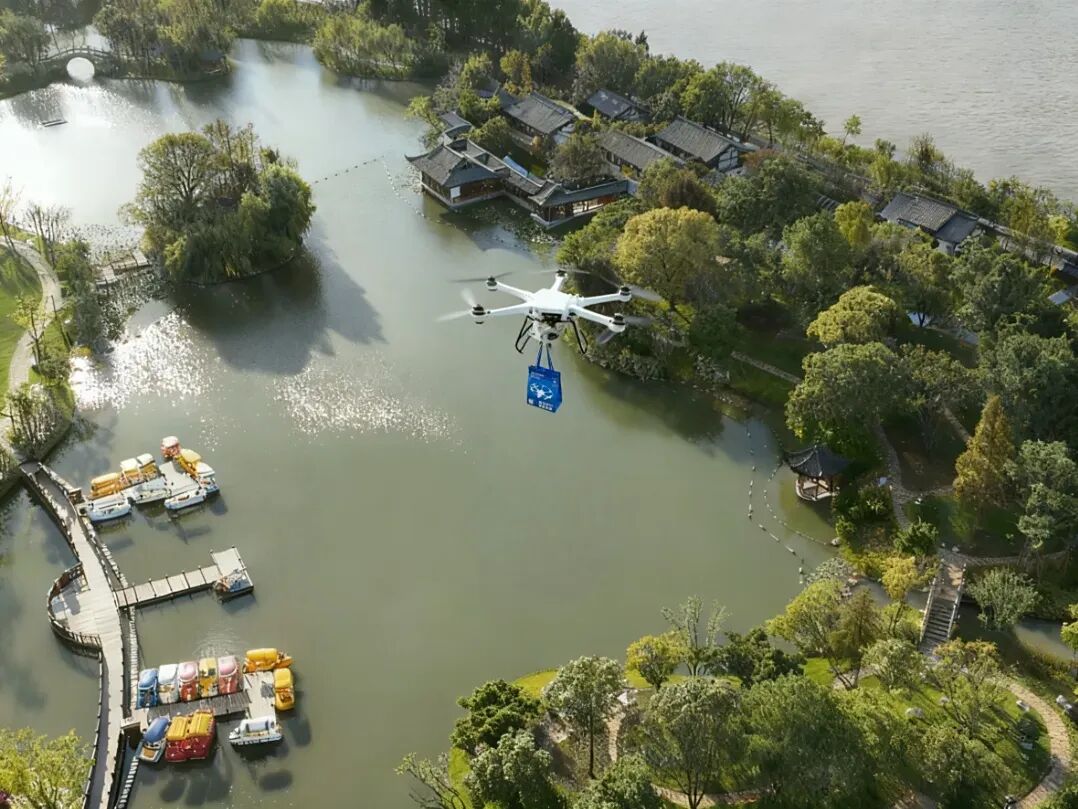 在"畅行温州"小程序下单,通过无人机将西园美食(如西式快餐、中式简餐、咖啡、糕点等)直接送达东园花柳古亭大草坪,解锁景区用餐新体验。