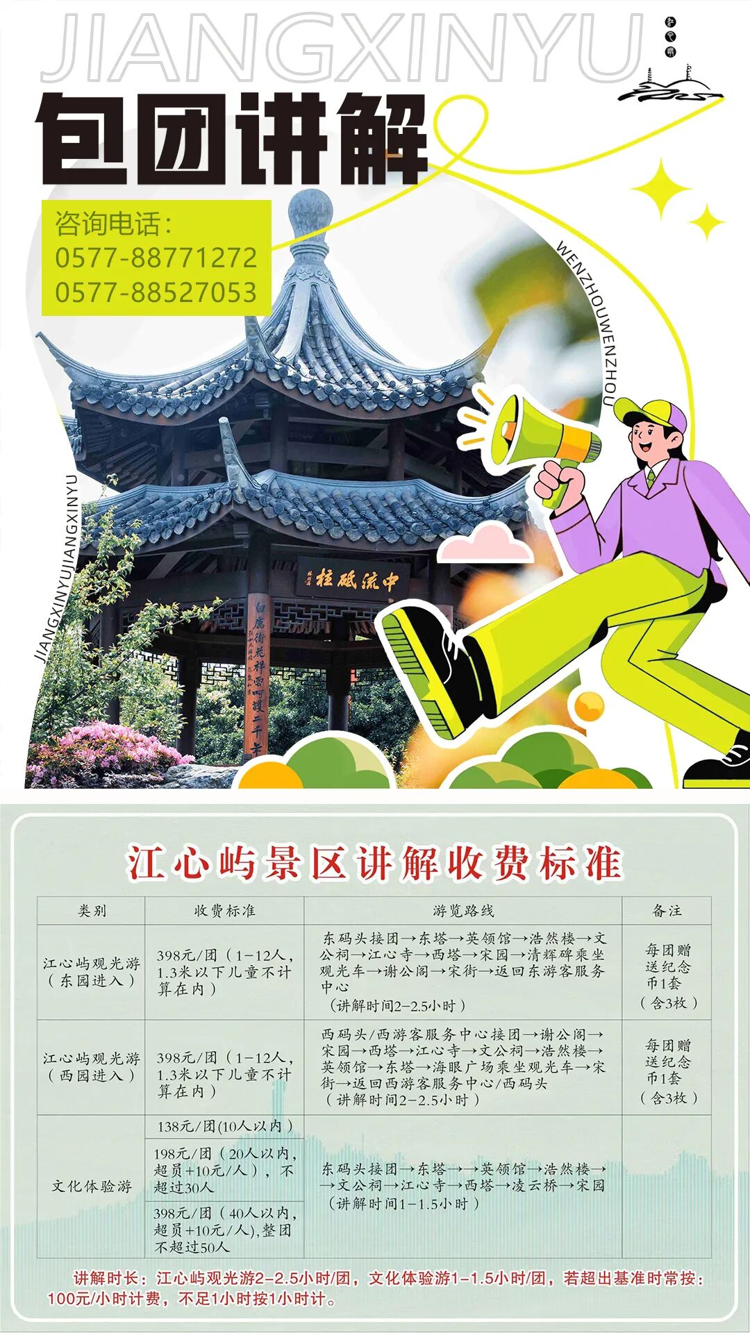 配备专业讲解员,为您和家人朋友提供专属讲解,深度了解江心屿历史文化,按团收费,适合家庭和小团体出游。