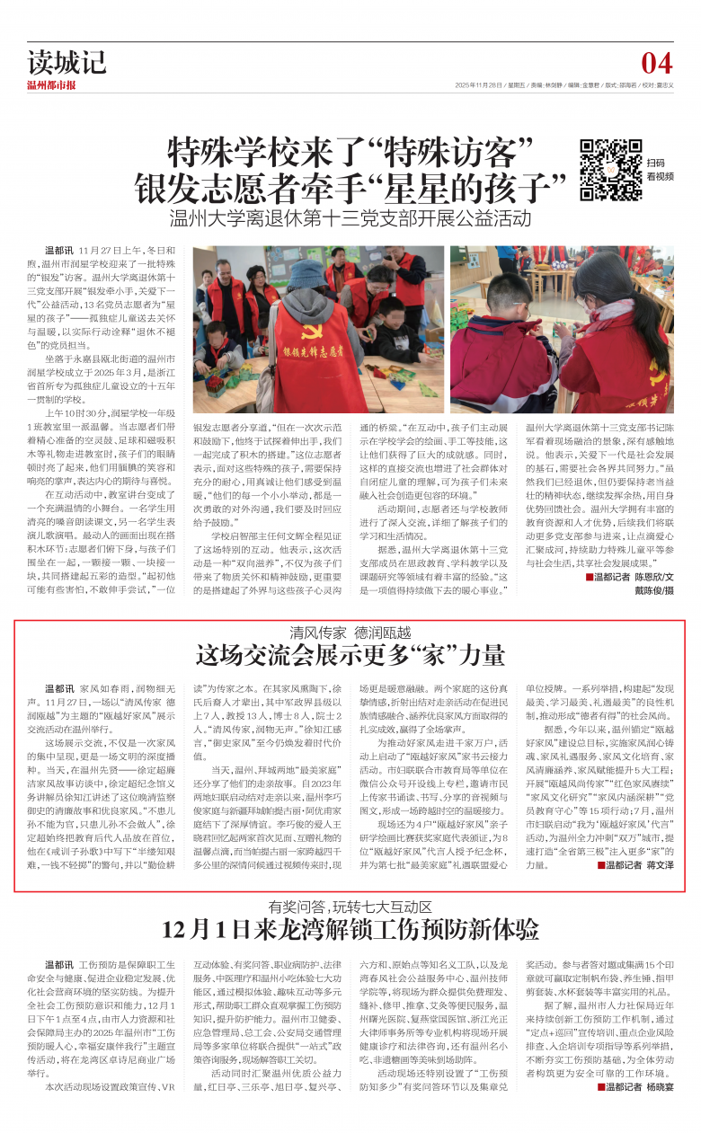 温都讯 家风如春雨,润物细无声。11月27日,一场以“清风传家 德润瓯越”为主题的“瓯越好家风”展示交流活动在温州举行。