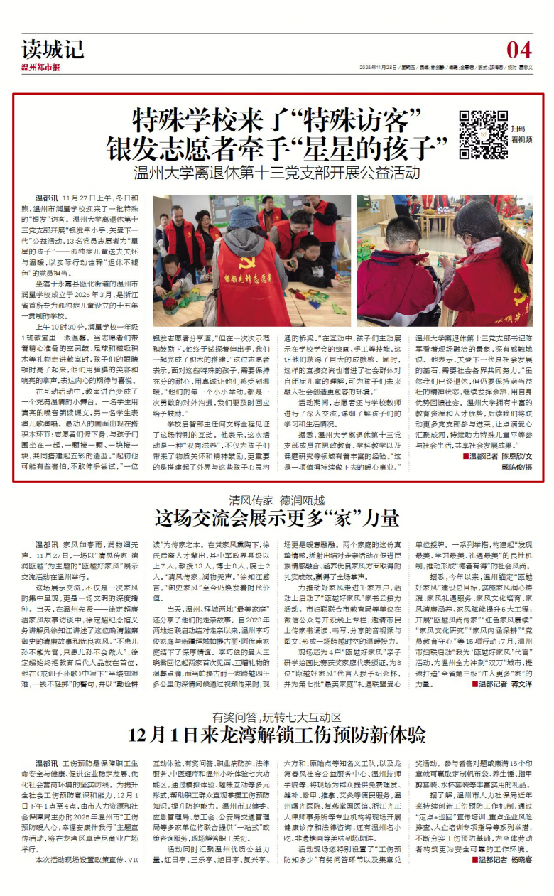 温都讯 11月27日上午,冬日和煦,温州市润星学校迎来了一批特殊的“银发”访客。温州大学离退休第十三党支部开展“银发牵小手,关爱下一代”公益活动,13名党员志愿者为“星星的孩子”——孤独症儿童送去关怀与温暖,以实际行动诠释“退休不褪色”的党员担当。
