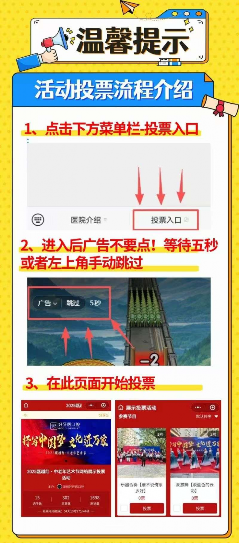 投票指南:关注微信公众号“温州好牙医口腔”→点击菜单栏“投票入口”(如出现广告按跳过)→投票页面→勾选5个节目→展开投票立即投票