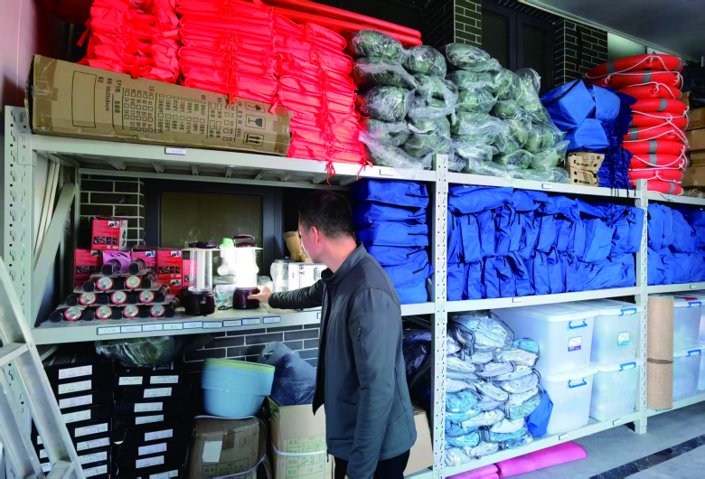 在瑞安市高楼镇龙腾村的物资仓库里,各类防汛防台物资摆放整齐