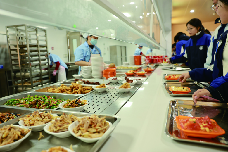 该校还采取全校自助选餐模式,根据不同学段学生的成长需求,在小学、初中和高中食堂分别设计差异化食谱。每餐提供12道荤素搭配的菜品,学生可按需选取3~4样。为引导学生科学膳食,选餐区配有德育导师现场指导营养搭配。初高中食堂另设盖浇饭、面食等特色风味窗口,进一步丰富了学生的选择。每月还特别设置“西餐日”,新颖的菜式深受学生欢迎。