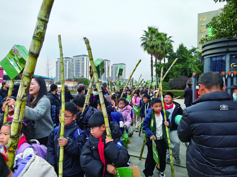 瑞安市陶山镇中心小学相关负责人介绍,陶山素有种植甘蔗的传统。自去年起,学校将农业试验基地调整为种植甘蔗,面积两三亩,由师生与专业种植人员共同参与栽培管理。“今年已是第二次向学生分发甘蔗,每人一根,丰收后不仅满足了全校2000多名师生的需求,还有不少富余。”