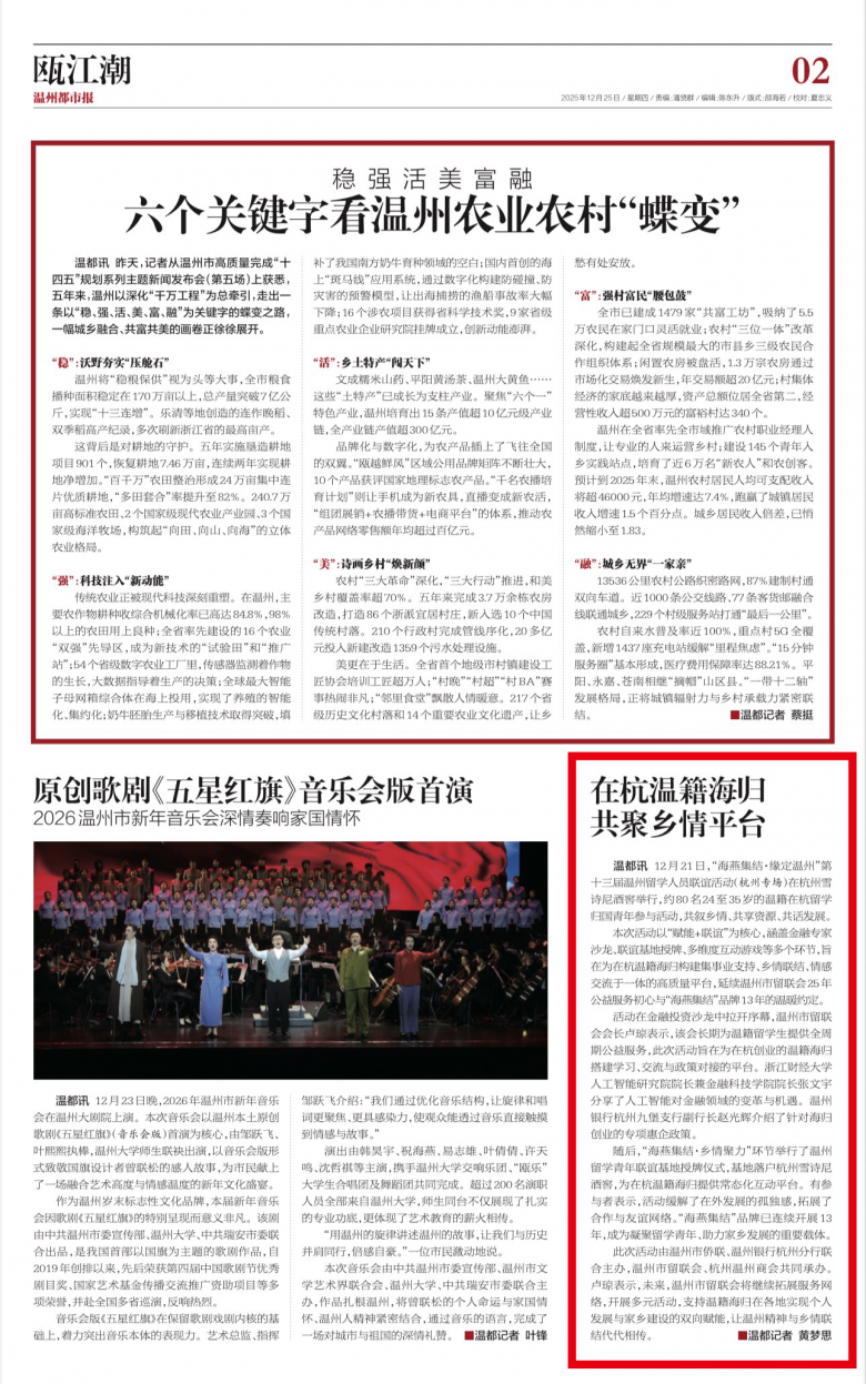 此次活动由温州市侨联、温州银行杭州分行联合主办,温州市留联会、杭州温州商会共同承办。卢琼表示,未来,温州市留联会将继续拓展服务网络,开展多元活动,支持温籍海归在各地实现个人发展与家乡建设的双向赋能,让温州精神与乡情联结代代相传。