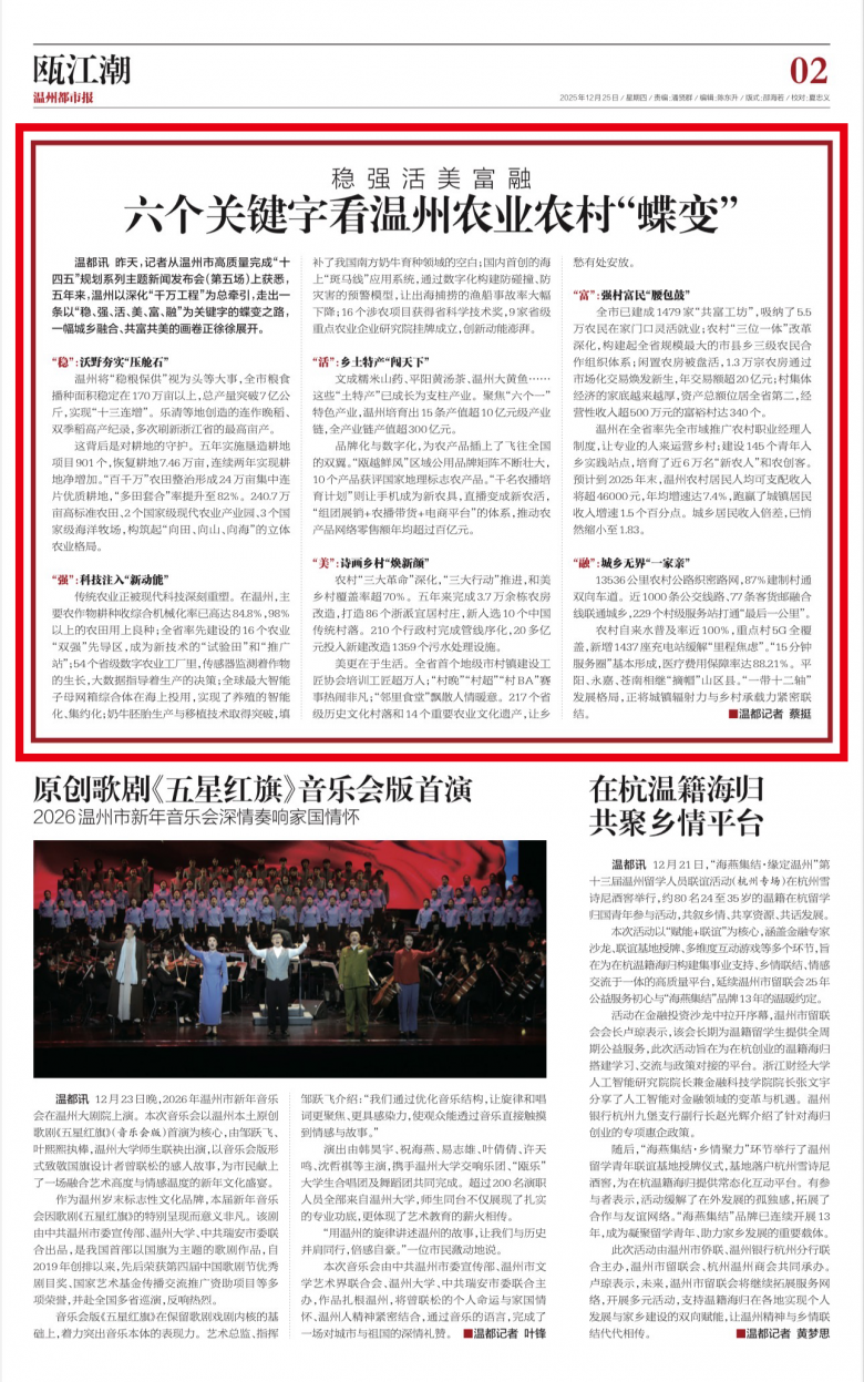 温都讯 12月24日,记者从温州市高质量完成“十四五”规划系列主题新闻发布会(第五场)上获悉,五年来,温州以深化“千万工程”为总牵引,走出一条以“稳、强、活、美、富、融”为关键字的蝶变之路,一幅城乡融合、共富共美的画卷正徐徐展开。