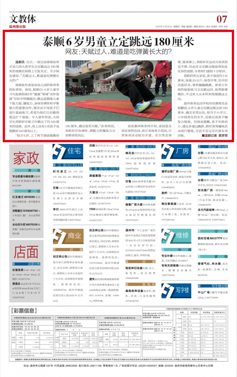该班教师林老师介绍,该园是全国足球特色园、浙江省体育示范园,日常体育活动较为丰富。在日常足球课、篮球课上,郑皓轩在运动方面表现也不错,但此次立定跳远能取得如此优异的成绩,令老师们感到十分惊讶。