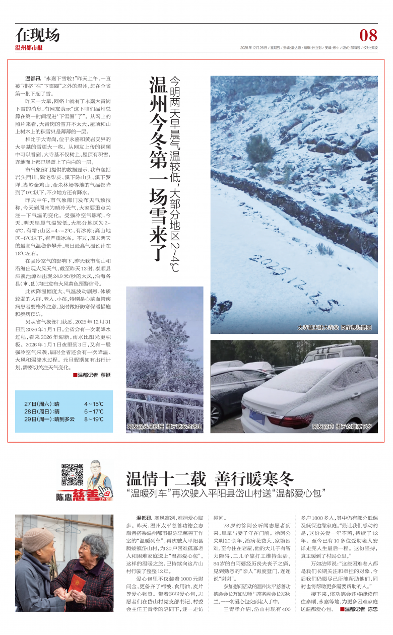 温都讯 “永嘉下雪啦!”12月25日上午,一直被“排挤”在“下雪圈”之外的温州,赶在全省第一批下起了雪。