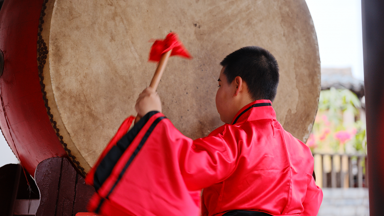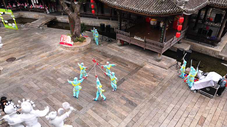 早上9点20分,在谯楼广场上,身着汉服的学子以18声厚重鼓鸣叩响新年之门,童声朗诵与西洋弦乐交织,古建与新声相映成趣。10点刚过,公园路古戏台前,师生接力演绎京剧、越剧经典选段,非遗韵味中藏着文化传承的热忱。10点45分,在五马雕塑区,几个校区同学通力合作,合唱团员唱响《如愿》,舞者铺展《美丽中国》画卷,跨越时空的旋律诉说着与祖国共成长的情怀。