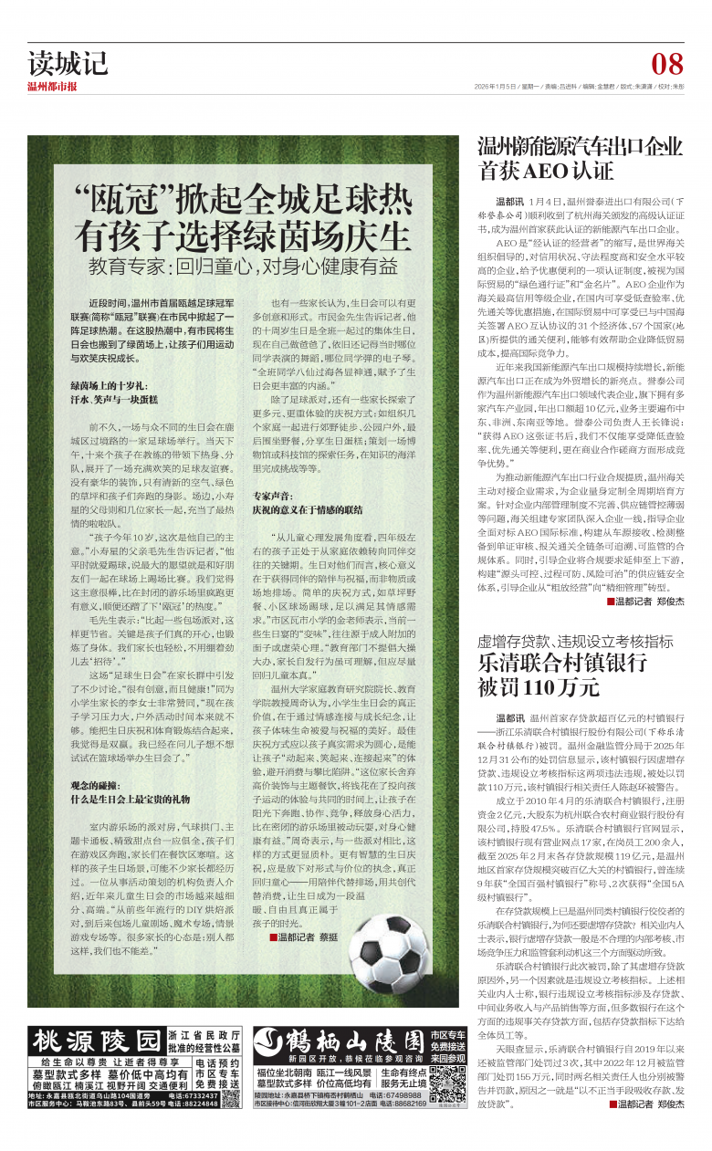 近段时间,温州市首届瓯越足球冠军联赛(简称“瓯冠”联赛)在市民中掀起了一阵足球热潮。在这股热潮中,有市民将生日会也搬到了绿茵场上,让孩子们用运动与欢笑庆祝成长。