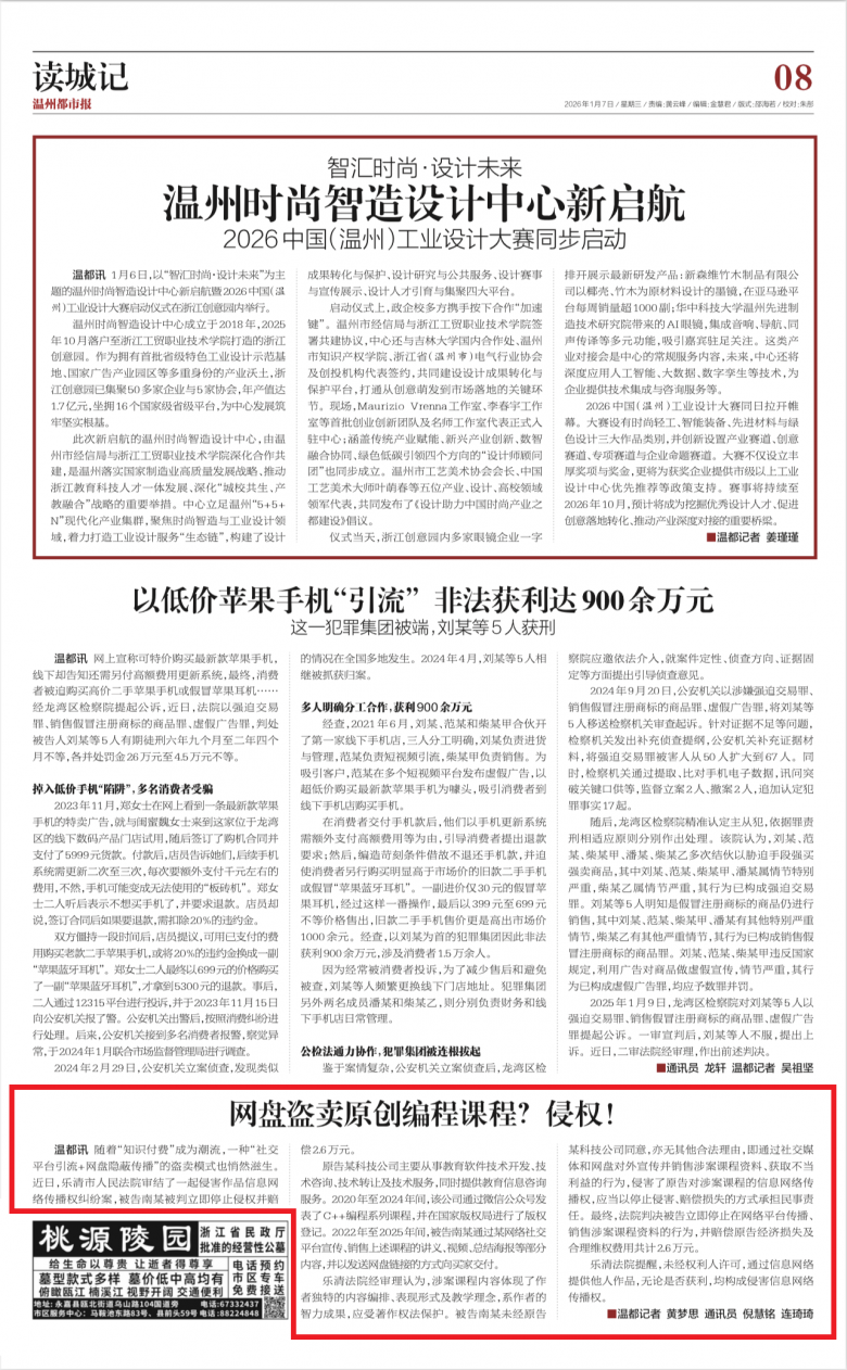 温都讯 随着“知识付费”成为潮流,一种“社交平台引流+网盘隐蔽传播”的盗卖模式也悄然滋生。近日,乐清市人民法院审结了一起侵害作品信息网络传播权纠纷案,被告南某被判立即停止侵权并赔偿2.6万元。