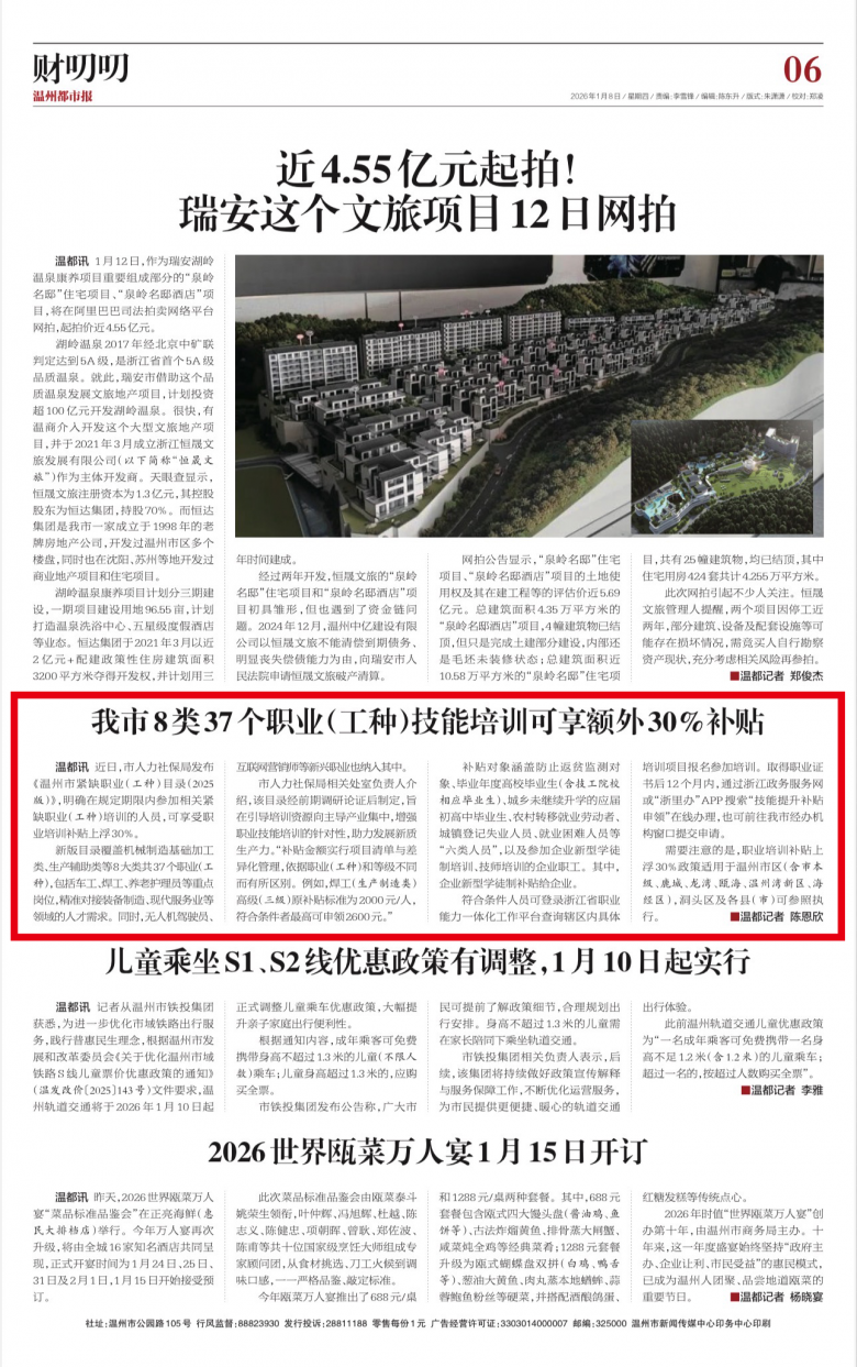 温都讯 近日,市人力社保局发布《温州市紧缺职业(工种)目录(2025版)》,明确在规定期限内参加相关紧缺职业(工种)培训的人员,可享受职业培训补贴上浮30%。