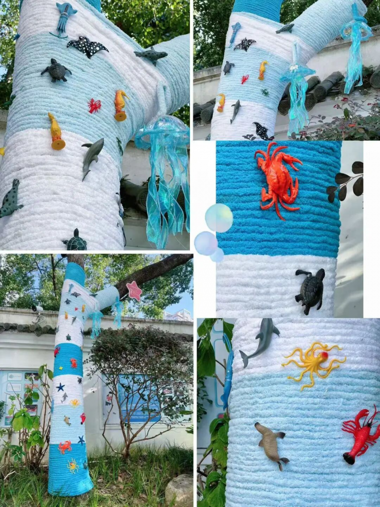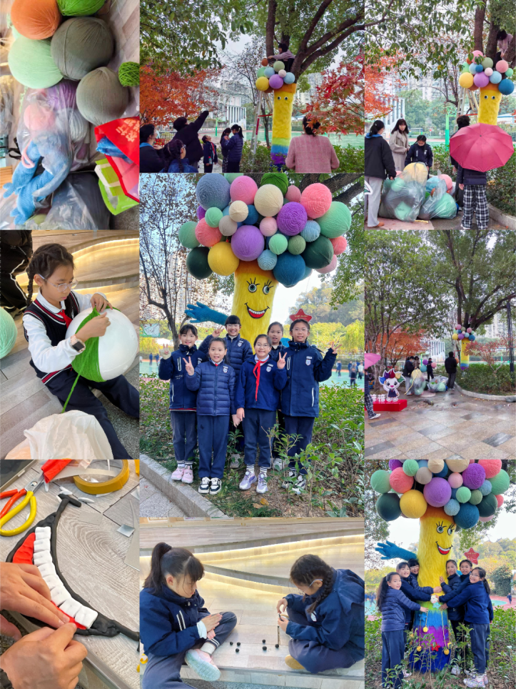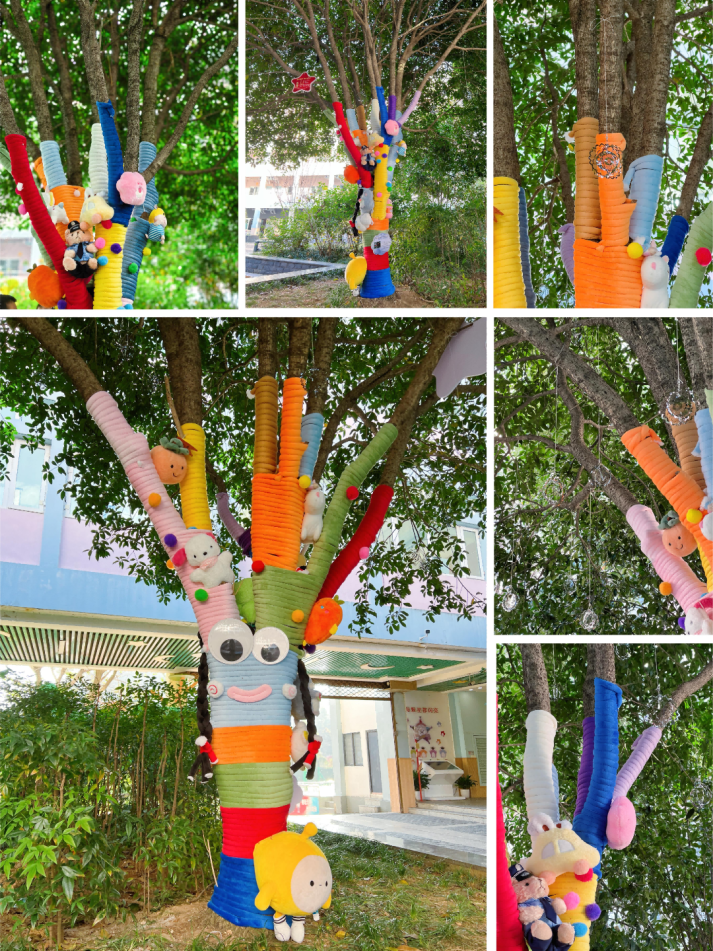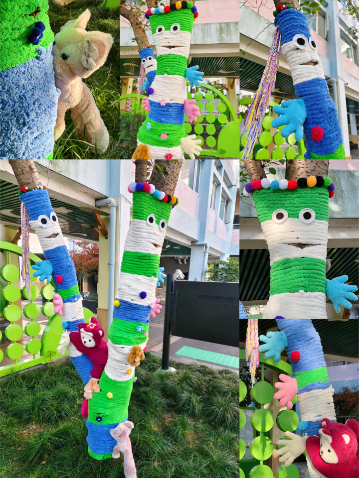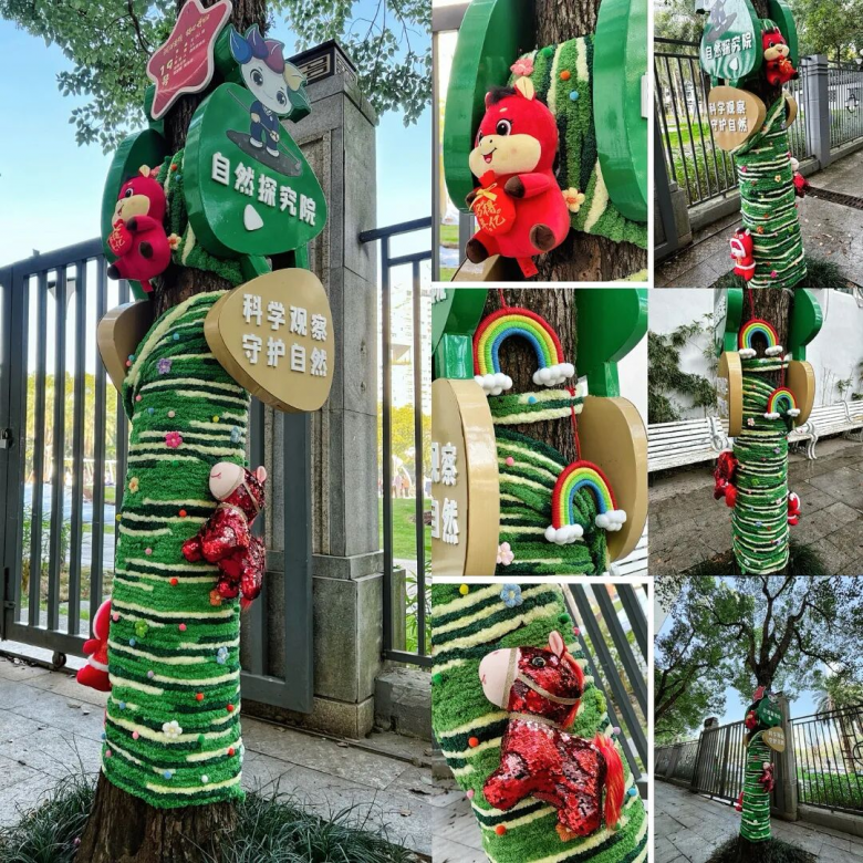 家校社协同发力,是本次活动顺利推进的关键支撑。从主题策划到材料筹备,从创意实施到树木养护,家长、教师与社区代表全程紧密合作。校园里一棵棵原本静默的树木,在老师、学生、家长们通过巧思妙想,精心雕琢下,焕发新生——有的化身“生态守护者”,传递着节水护源的理念;有的变作“童话森林”,承载着童真与友好的情怀;有的成为“红色印记”,无声诉说着赤诚与传承的初心。每一处装饰,不仅是对树木的装扮,更是情感的纽带、五育融合的生动实践。孩子们在陪伴中感知爱意,在劳动中学会责任,在创造中收获自信与幸福。