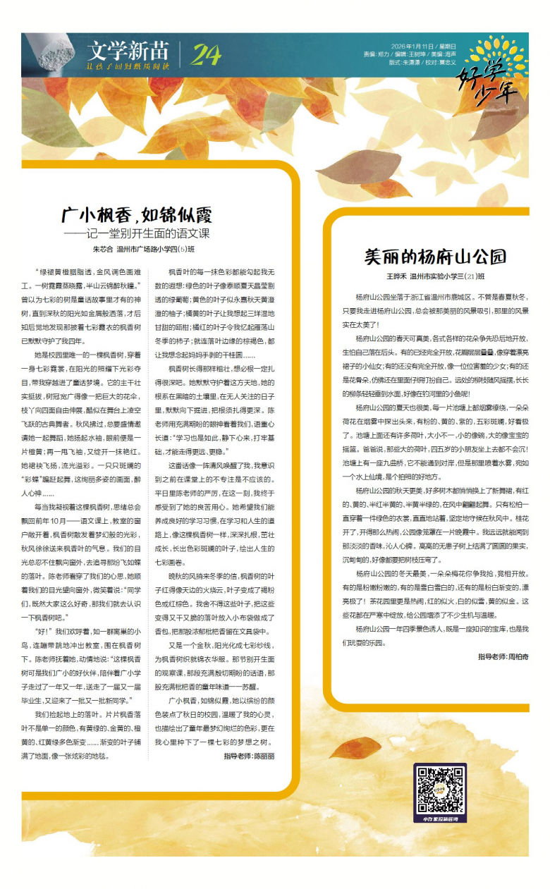 每当我凝视着这棵枫香树,思绪总会飘回前年10月——语文课上,教室的窗户敞开着,枫香树散发着梦幻般的光彩,秋风徐徐送来枫香叶的气息。我们的目光总忍不住飘向窗外,去追寻那纷飞如蝶的落叶。陈老师看穿了我们的心思,她顺着我们的目光望向窗外,微笑着说:“同学们,既然大家这么好奇,那我们就去认识一下枫香树吧。”