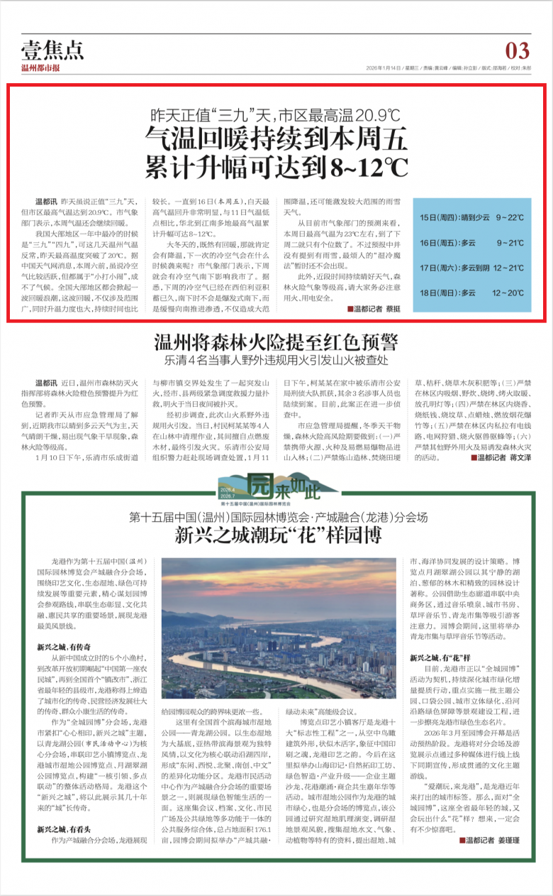 温都讯 1月13日虽说正值“三九”天,但市区最高气温达到20.9℃。市气象部门表示,本周气温还会继续回暖。