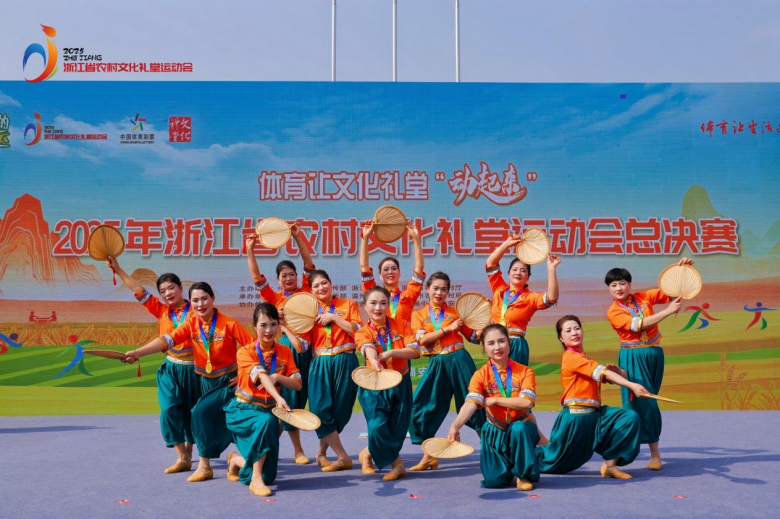 与此同时,在宋岙村文化礼堂旁的健身广场上,健身操舞比赛同步进行。来自台州、宁波、舟山、温州等地的10支队伍依次登场。队员们身着绚丽服饰,伴随欢快旋律,以整齐有力的舞姿、富有创意的编排,充分展现健身操舞的动感与美感,赢得观众阵阵掌声。