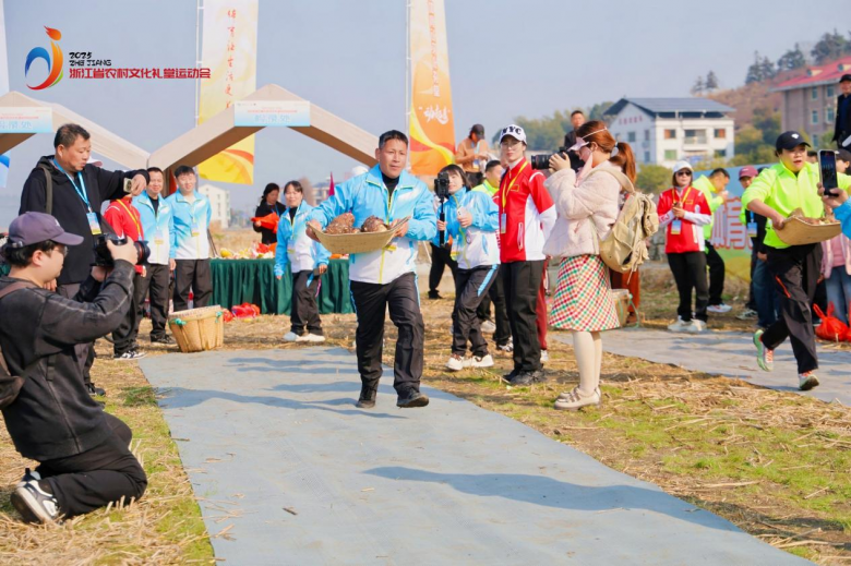 17日上午,曹村镇宋岙村文化礼堂旁的农田成为热闹的赛场。农民趣味运动会在此火热举办,徒手捉泥鳅、运送果实、抢收抢种、玉米剥皮、锯木比赛、簸箕运毛芋、田园接力跑等竞赛项目,取材于日常农耕生活,兼具浓郁的乡土气息与竞技趣味。