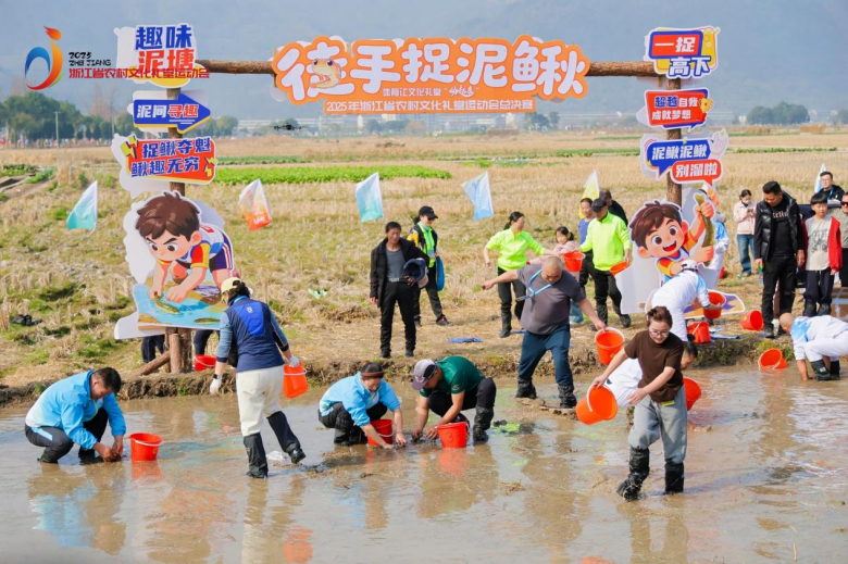 “徒手捉泥鳅”项目将现场气氛推向高潮。泥鳅在泥水中灵活穿梭,参赛者们俯身围捕,一时水花四溅、笑语连连。衢州代表队的郑晓勇凭借娴熟技巧,成功捕捉二三十条泥鳅,他说:“这些项目都是我们熟悉的农事场景,让我重温了童年劳动时的快乐。”