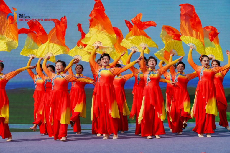 温州代表队带来的原创舞蹈以瑞安传统婚礼为创作背景,融入当地特色民俗元素“糖金杏”,还原了喜庆热闹的婚俗场景。这支队伍平均年龄约60岁,为呈现最佳表演效果,队员们坚持排练三个月,反复打磨动作细节。队员林慧红说:“运动会为我们提供了展示与交流的平台,能通过舞蹈展现瑞安本土文化,感到格外有意义。”