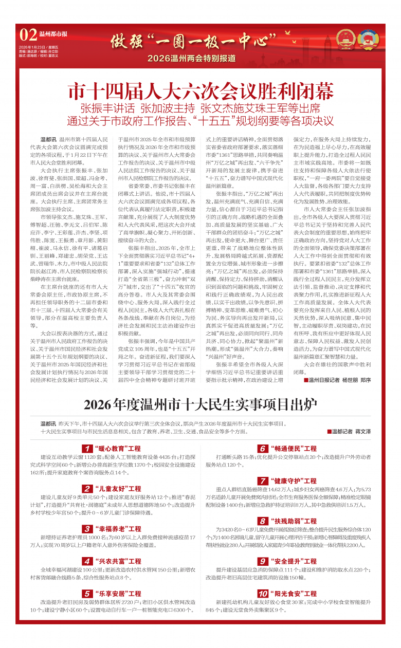 温都讯 1月22日下午,温州市十四届人大第六次会议举行第三次全体会议,票决产生2026 年度温州市十大民生实事项目。