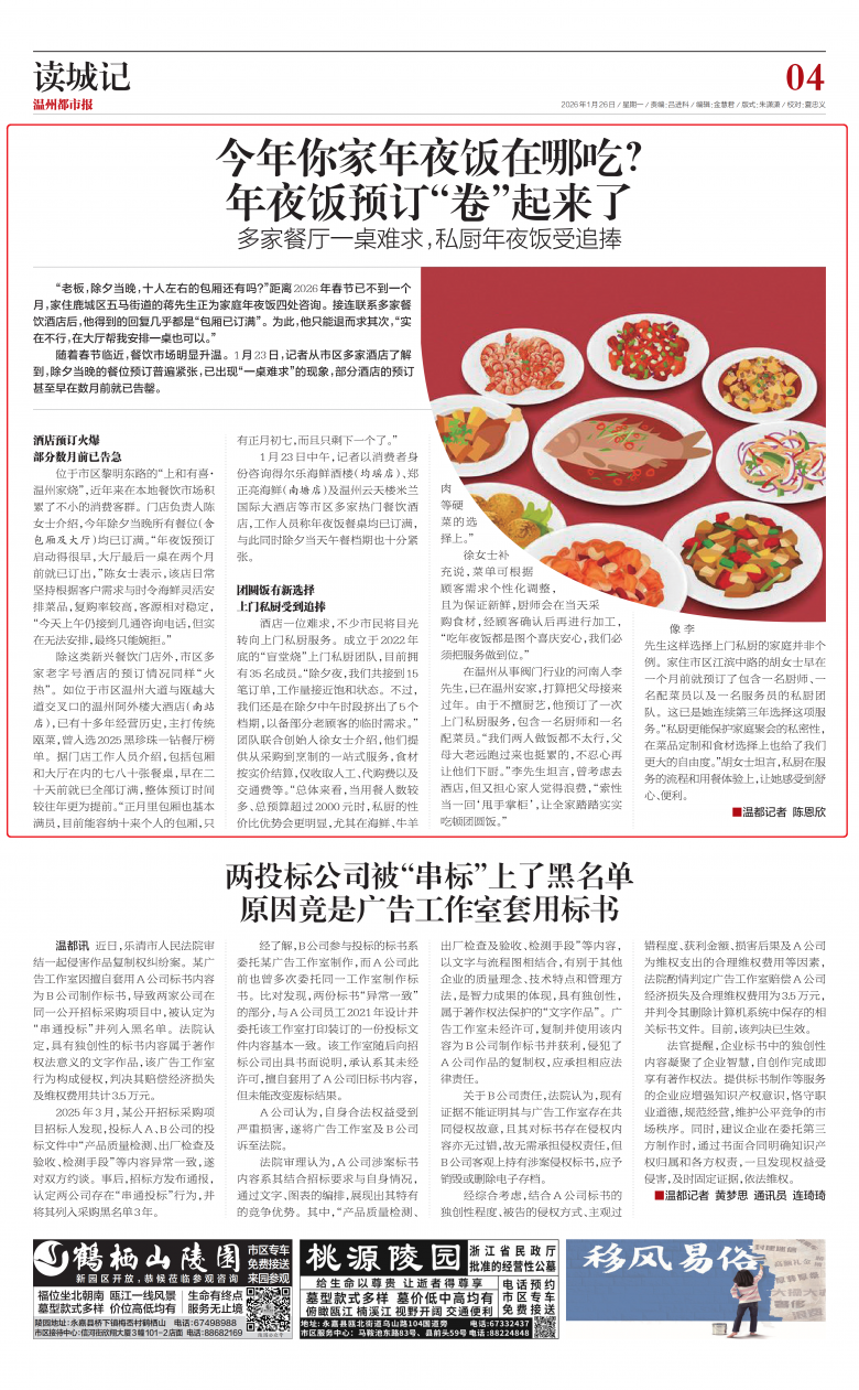 “老板,除夕当晚,十人左右的包厢还有吗?”距离2026年春节已不到一个月,家住鹿城区五马街道的蒋先生正为家庭年夜饭四处咨询。接连联系多家餐饮酒店后,他得到的回复几乎都是“包厢已订满”。为此,他只能退而求其次,“实在不行,在大厅帮我安排一桌也可以。”