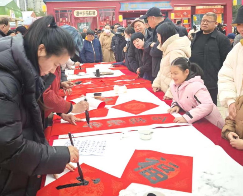 1月25日,“福送万家,联暖新春”2026温州“六个一”土特产嘉年华新春公益送春联活动现场,红彤彤的装饰映照着每个人喜气洋洋的笑脸,洋溢着浓浓的年味。温州市东方道德文化学会副会长、温州市诗词楹联学会原理事、书画家谢慈恩,书画家温高潮、市慈善总会慈善书画会汪筱芳,以及郭溪一小教师龚菀茹来到现场为市民写福字、送春联。