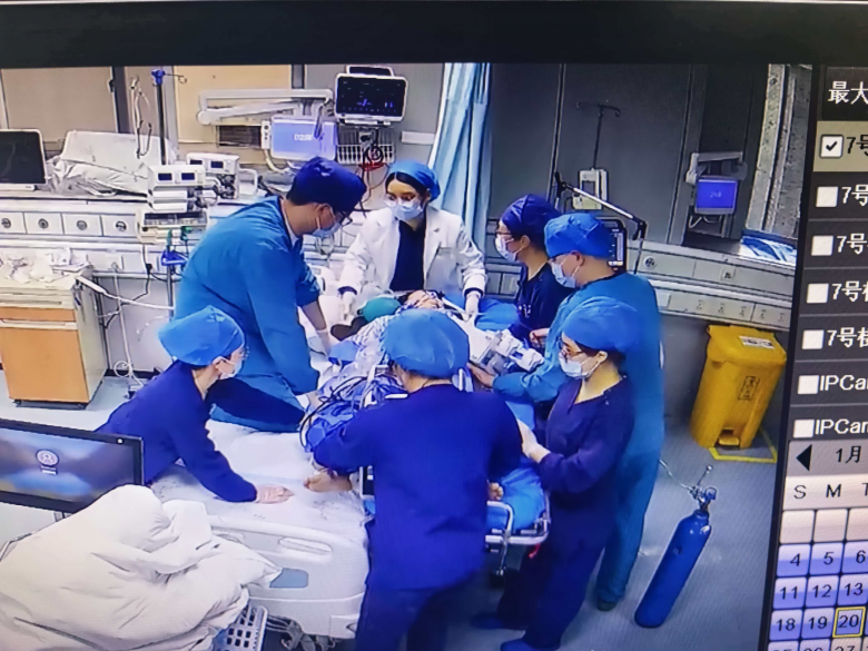 12时04分接到求援讯息,温州市中心医院重症医学科主任汪晓波和心内科主任医师林斌立即制定了ECMO下PCI救治方案。12时15分,ECMO核心成员迅速集结,携专用救援设备快速抵达永嘉县人民医院。12时50分到达时发现患者意识丧失,心脏反复停跳,病情极其严重,团队果断决定背水一战。12时55分开始穿刺、预充,13时13分成功为患者建立ECMO转流循环支持。