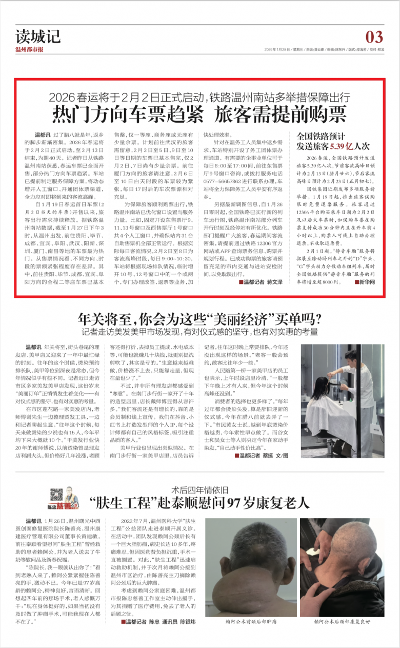 温都讯 过了腊八就是年,返乡的脚步渐渐密集。2026年春运将于2月2日正式启动,至3月13日结束,为期40天。记者1月27日从铁路温州南站获悉,春运车票已全面开售,部分热门方向车票趋紧。车站已提前制定服务保障方案,将动态增开人工窗口、开通团体票渠道,全力应对即将到来的客流高峰。