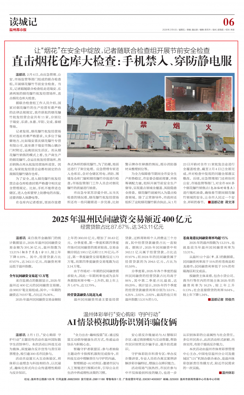 温都讯 2月4日,由应急管理、公安、市场监管等部门组成的联合检查组,开展烟花爆竹节前安全检查。当天,记者跟随联合检查组走进瑞安、乐清两地的烟花爆竹批发经营场所,直击烟花仓库大检查。