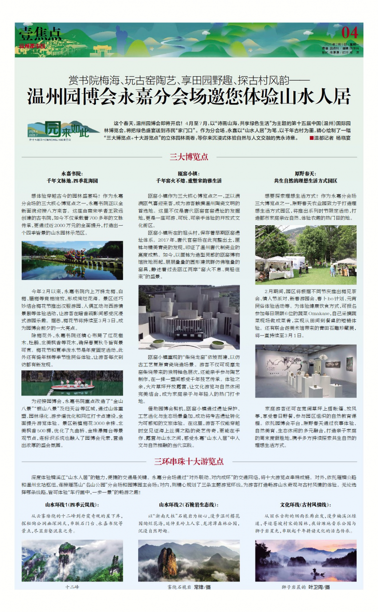 这个春天,温州园博会即将开启!4月至7月,以“诗画山海,共享绿色生活”为主题的第十五届中国(温州)国际园林博览会,将把绿色盛宴送到市民“家门口”。作为分会场,永嘉以“山水人居”为笔,以千年古村为墨,精心绘制了一幅“三大博览点+十大游览点”的立体园林画卷,等你来沉浸式体验自然与人文交融的隽永诗意。