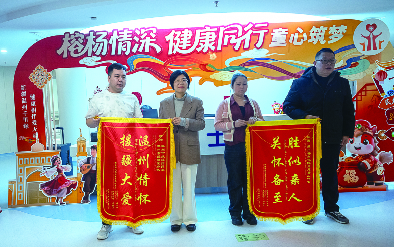 患儿家属向温州市援疆指挥部、温州都市报陈忠慈善工作室、温医大附二院儿童心血管科、童心筑梦团队及温州太平慈善功德会赠送锦旗。他们说:“温州的干部、医生和爱心人士给予我们无私帮助,不仅治好了孩子的病,还承担了所有费用,真是太感谢了。”