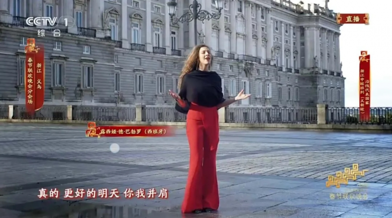 除了《踏地为节》舞蹈,在义乌分会场由成龙与传奇歌手莱昂纳尔·里奇同台演唱的原创曲目《世界义乌中国年》,同样有胡茜旗下的签约歌手——西班牙青年歌手露西亚·德·巴勃罗参与。他们以跨时空云合唱的方式,将新春祝福传递至世界每一个角落。