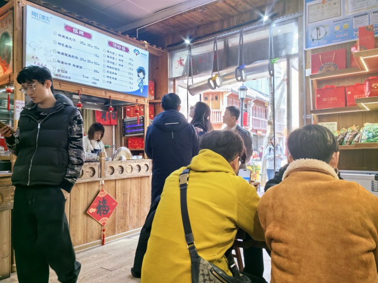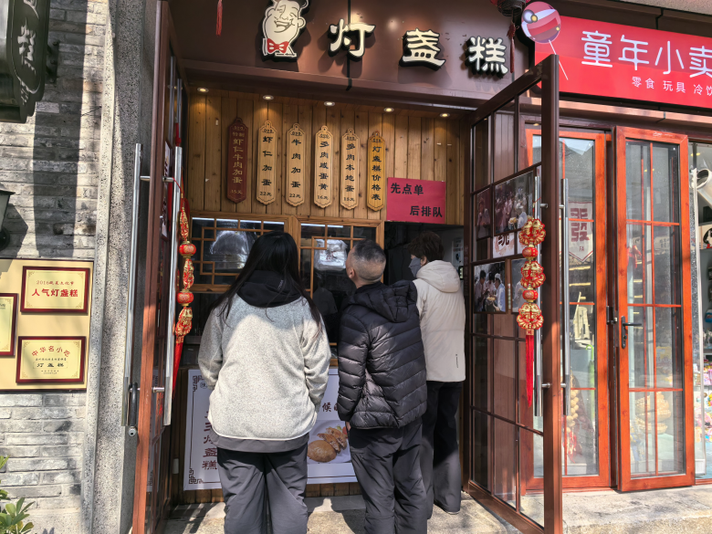 人潮涌动间,沿街店铺也跟着热火朝天。“老板,这个灯盏糕怎么卖?”“多肉咸蛋黄和虾仁加蛋,哪个好吃点?”在陈记灯盏糕门店前,围着众多前来尝鲜的游客。油锅滋滋作响,金黄的灯盏糕在漏勺里翻滚,香气飘出老远。在被告知没有现货,还要等上十分钟时,来自江苏的吴先生一家迟疑了片刻,还是选择取了号。“来都来了,肯定要尝一尝。”