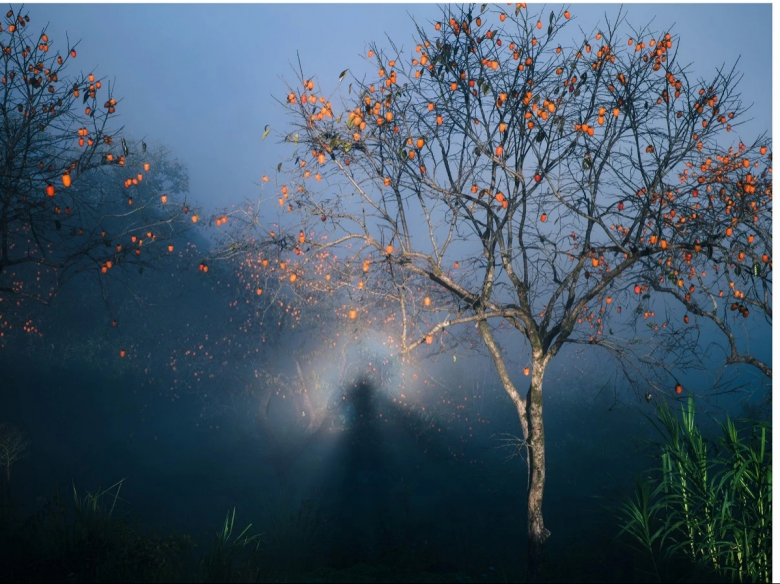 在创作中,吴培军大胆运用“黑白灰+红”的色彩结构,赋予作品更强的艺术表现力,也让柿子这一传统题材在现代摄影语言中焕发出新的生命力。这不仅体现了他对风光摄影的持续探索,也让观众在欣赏中感受到传统文化的当代表达。