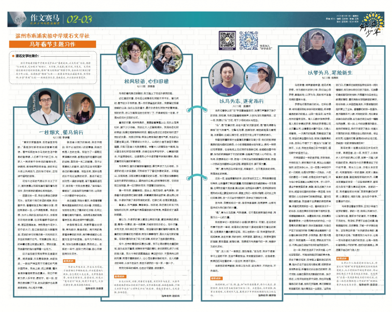 老师点评:构思新颖,以“马、騳、骉、驷”四字层层展开,将个人成长、亲情陪伴、集体力量与诚信诺言融为一体。立意高远,文辞典雅,既有古典韵味,又有时代气息,展现出少年开阔的胸襟与向上的志向。