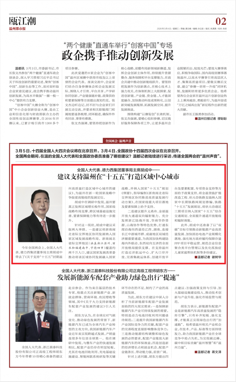今年全国两会上,全国人大代表、德力西集团董事局主席胡成中带去了《关于支持“十五五”时期温州高质量打造区域中心城市的建议》,为温州在新一轮国家战略中争取更高能级的发展定位。