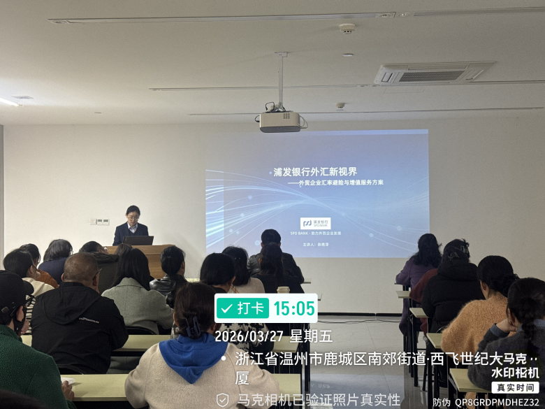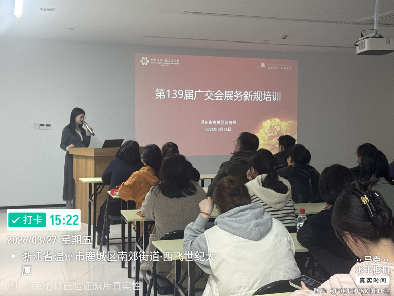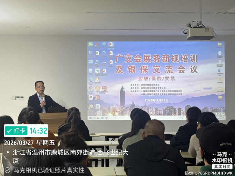 温都讯 3月27日,由鹿城区商务局主办、温州永佳园区管理有限公司承办的“鹿城区2026广交会展务新规培训及银保交流会议”,在南郊街道中国智能谷软件园永佳数字贸易园区会议室举行。