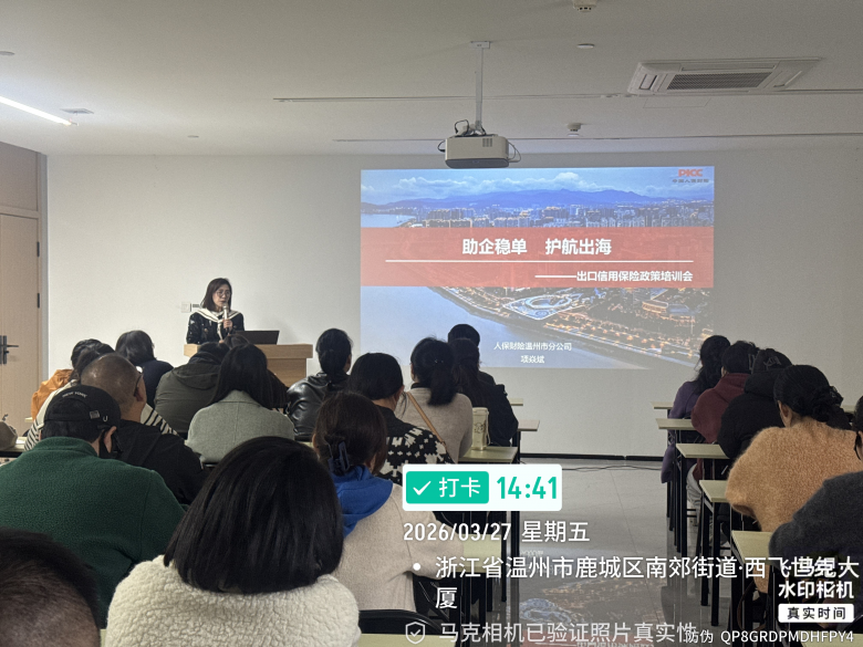 “外贸拓市场,如何把钱安全收回来,是不少企业的‘心头忧’。”针对这一痛点,在这次“集训”上,人保财险温州市分公司资深工作人员在深入剖析了当前国际外贸出口贸易风险形势后,详细介绍了浙江省商务厅、浙江省财政厅开展的2026年浙江省出口小微政策统保相关工作,充分发挥出口信用保险作用,提高小微外贸企业的抗风险能力和市场开拓力。并详细介绍了外贸企业如何通过浙江国际贸易“单一窗口”申领政策性保单,通过政府政策性信用保险,让企业在抢单方面拥有更多选择。