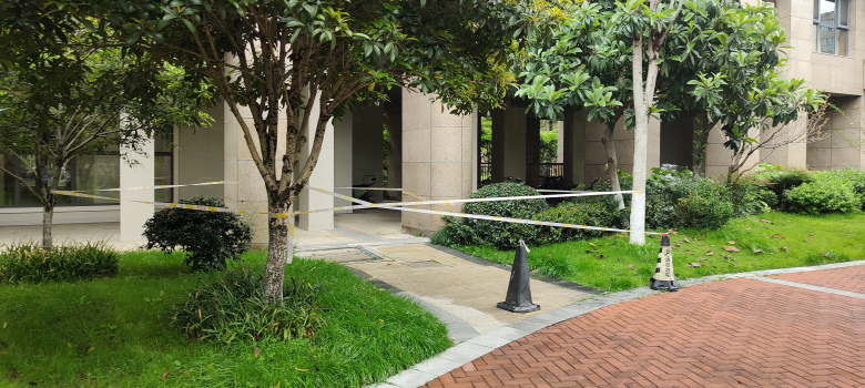 8栋和12栋的入户门前均拉着警戒线,提醒居民绕行。就在不久前,这两栋楼刚刚发生过外墙瓷砖脱落。