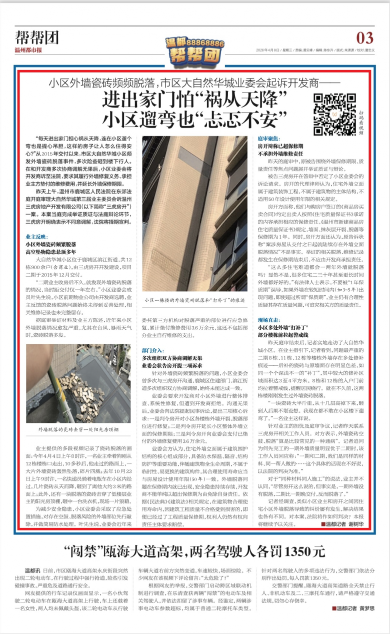 “每天进出家门担心祸从天降,连在小区遛个弯也是提心吊胆,这样的房子让人怎么住得安心?”从2015年交付以来,市区大自然华城小区频发外墙瓷砖脱落事件,多次险些砸到楼下行人。在和开发商多次协商调解无果后,小区业委会将开发商诉至法院,要求其履行外墙修复义务、承担业主方垫付的维修费用,并延长外墙保修期限。