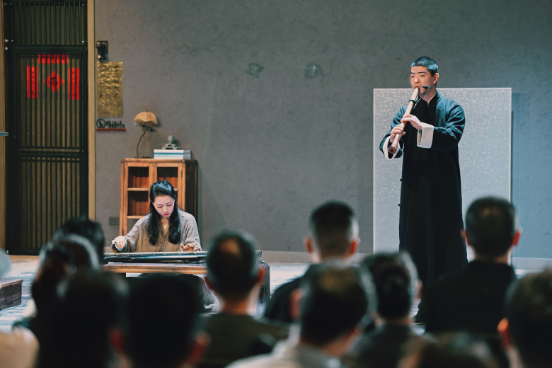 活动现场,中国乐曲协会古琴研究会副秘书长、古琴家吴映雪与温州络声音乐主理人、笛箫演奏家杜晓帆联袂演绎原创新作《吾心安处》,清越古琴与悠远笛箫声声相和,为整场活动铺就了饱含哲思的诗意底色。