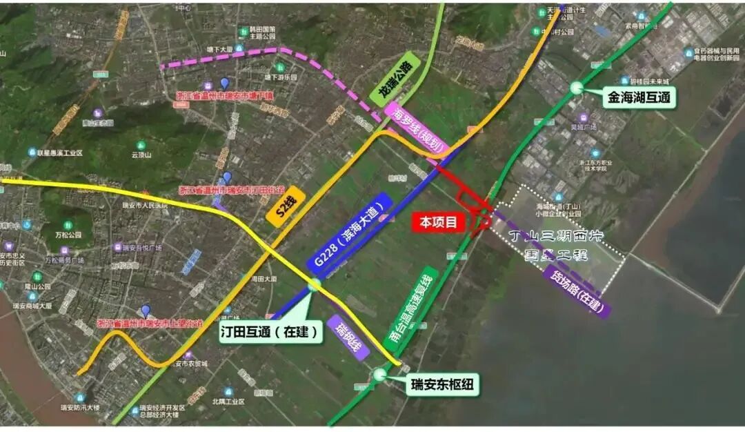该工程位于瑞安市塘下镇,金海湖互通和瑞安枢纽之间,采用单喇叭互通形式,设互通服务设施1处,利用规划海罗线向西接228国道,向东接瓯飞丁山三期围垦区。本项目的建设,将优化瑞安东部区域交通出行条件,促进塘下新区发展,加快瓯飞工程建设,服务瑞安城市东拓和环大罗山科创走廊带建设,促进区域经济社会协调发展。