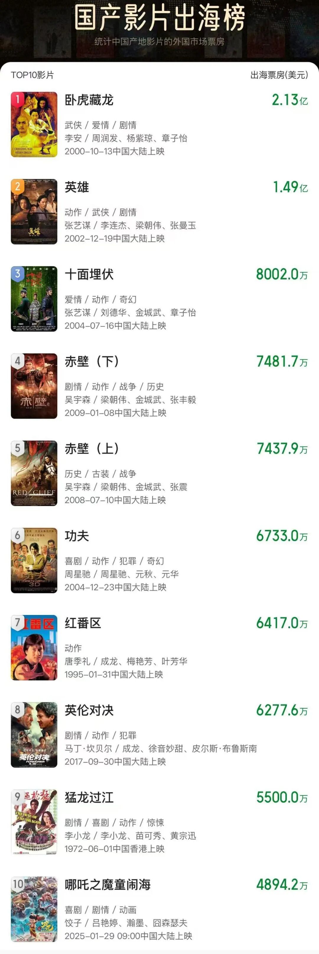 据网络平台数据,《哪吒之魔童闹海》出海票房超4894.2万美元,冲进国产电影出海榜前十!截至当前全球累计票房已达155亿,暂列全球影史票房榜前5!(更多内容请点击详情)